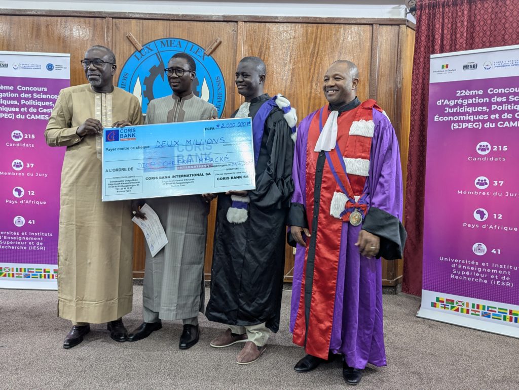 Cette distinction honorifique a été proclamée à l’occasion de la cérémonie de clôture du Concours d’Agrégation des SJPEG, qui s’est déroulée le vendredi 21 novembre 2025, à l’Université Cheikh Anta Diop de Dakar. Le lauréat a reçu son chèque géant de deux millions de Francs CFA et son attestation, des mains du Ministre de l’Emploi et de la Formation professionnelle et technique du Sénégal, M. Amadou Moustapha Ndieck SARRE et du Secrétaire Général du CAMES, Pr Souleymane KONATÉ.